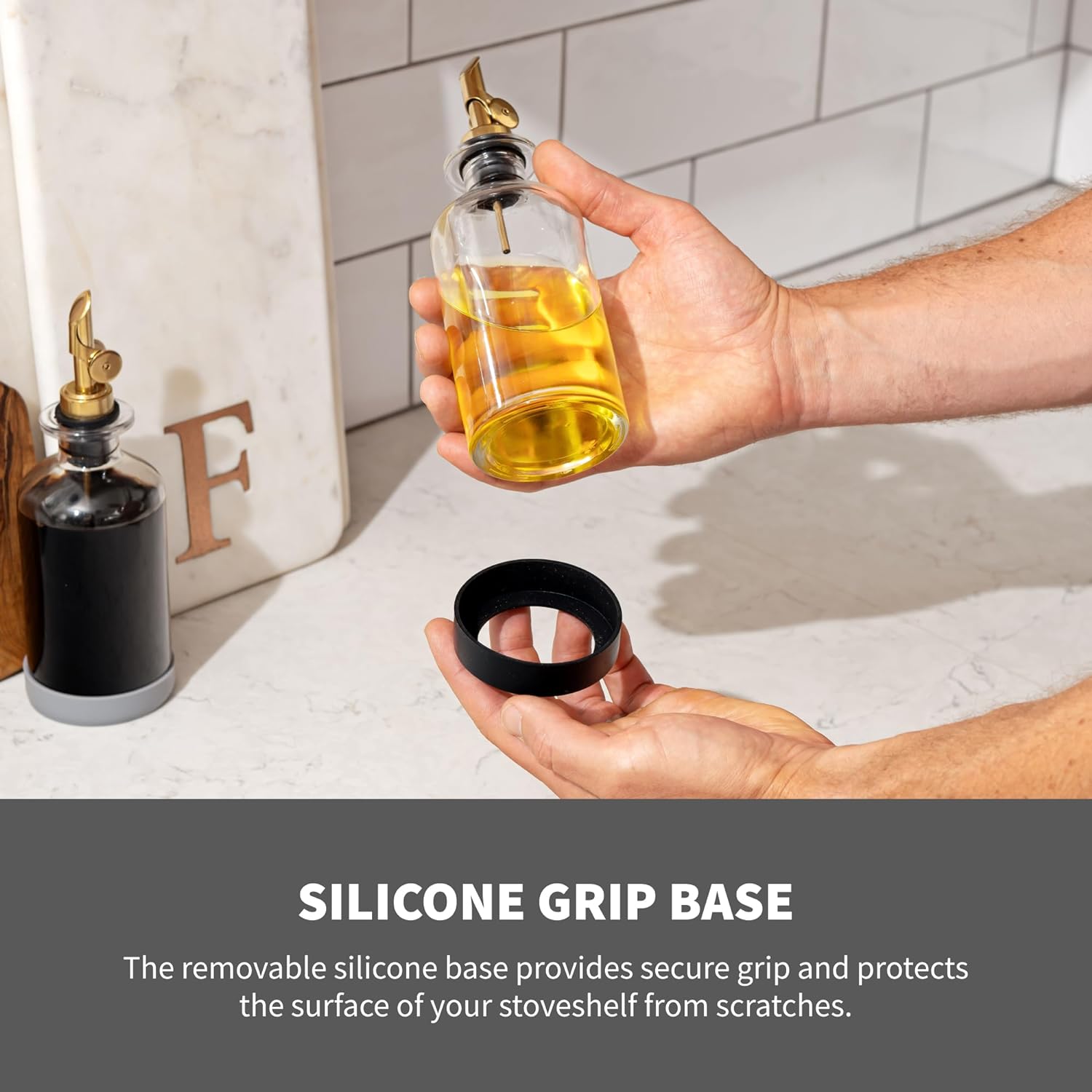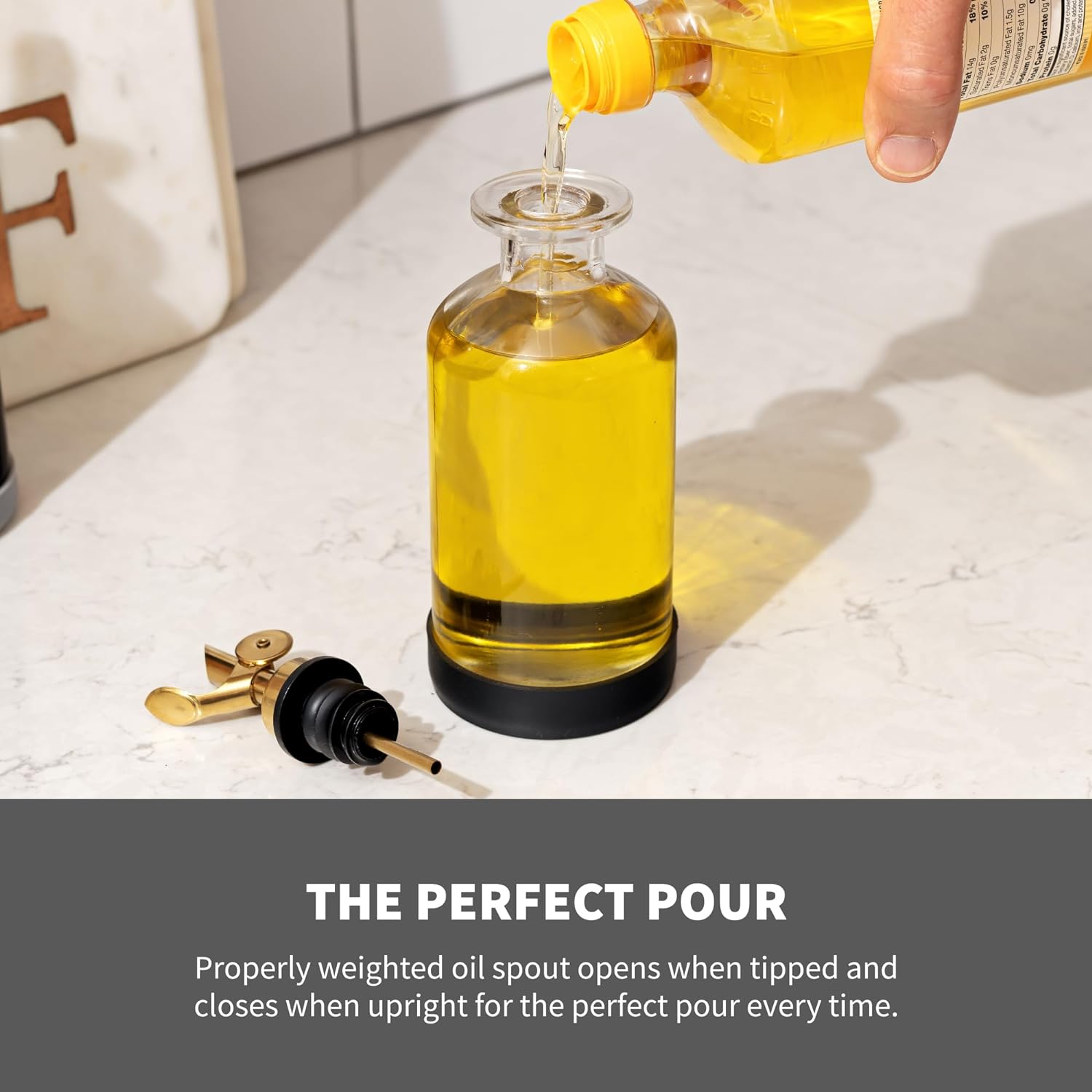 THE PERFECT POUR: Properly weighted oil spout opens when tipped and closes when upright for the perfect pour every time